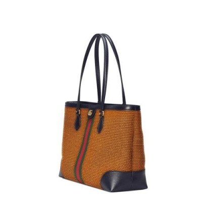 GUCCI/古驰 中号驼色稻草编织蓝色皮革饰边红绿条纹装饰单肩手提包